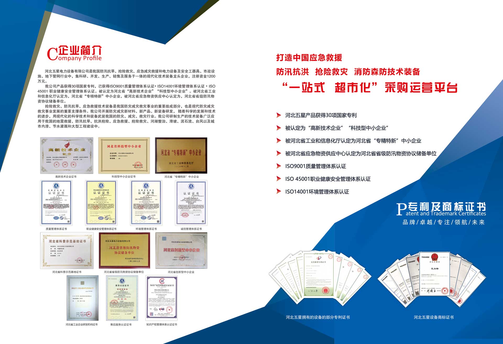 河北五星電力設(shè)備有限公司是我國防汛抗旱、搶險(xiǎn)救災(zāi)、應(yīng)急減災(zāi)救援和電力設(shè)備及安全工器具、市政設(shè)施、地下管網(wǎng)行業(yè)中,集科研、開發(fā)、生產(chǎn)、銷售及服務(wù)于一體的現(xiàn)代化技術(shù)裝備高新技術(shù)企業(yè),注冊資金1200萬元。  我公司產(chǎn)品已獲得ISO9001質(zhì)量管理體系...